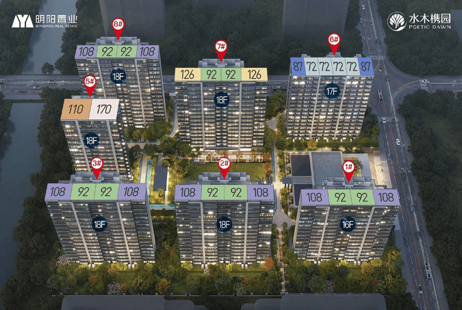 规划楼栋及户数:7 幢高层(16-18F)共 484 户;1 幢配套用房。