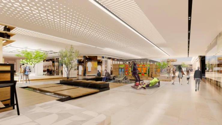 购物中心首层的设计回溯到古典时代城市中央大道,车马花灯驶过周日清晨的街道,街坊老少隔着街道闲聊;二层的过道是邻里相望的露台,家长带着孩子在露台上看巡演,仿佛从不远的未来回看当下的美好场景;三层的走道是时空穿梭之廊,金属质感和明快色彩创造出超越现实的氛围,仿佛置身未来世界。富有亲和力的公区使人倍感舒适,高品位有调性的商铺让人漫步流连,在这里,每个人都自在随心。