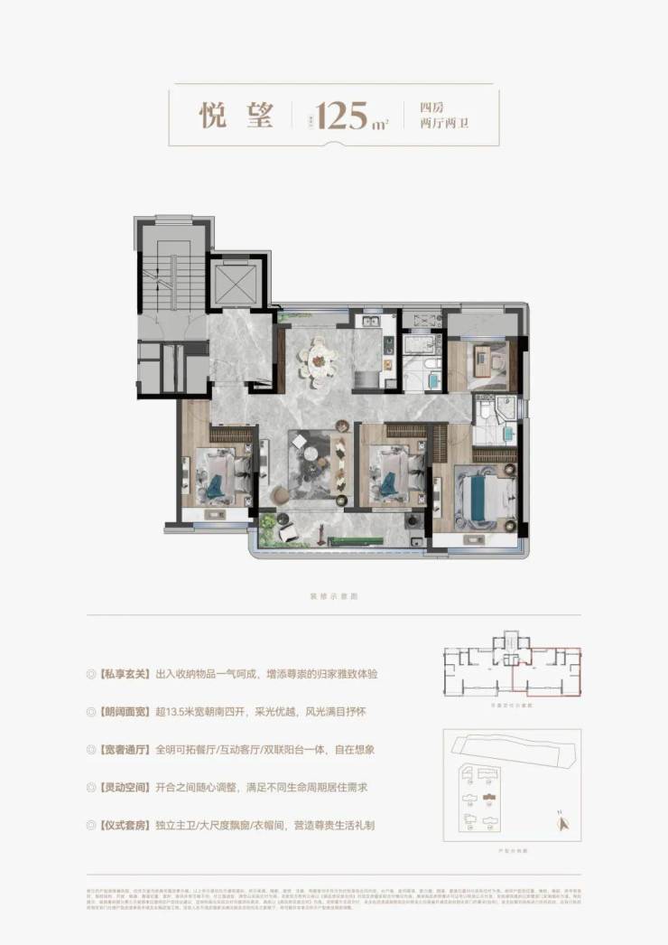 另外,拥享约10.5米朗阔面宽、约6.9米双联阳台、LDKG奢阔通厅等创新规划的建面约115㎡,与设计私享玄关、超13.5米朝南四开间、一体化餐客厅等建面约125㎡,营造一种别样沉浸式的丰盛意趣体验。