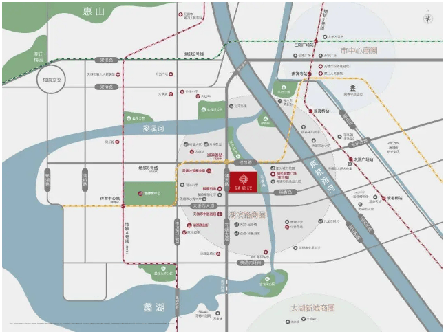 生活配套:楼盘周边直线 3km 范围内有 22 个一级及以上医院,3km 范围内有 13 个商场,包括阳光购物广场、无锡方圆荟购物中心、无锡滨湖万象汇等;周边 3km 范围内有 38 个公园,距离最近的仅 328m。