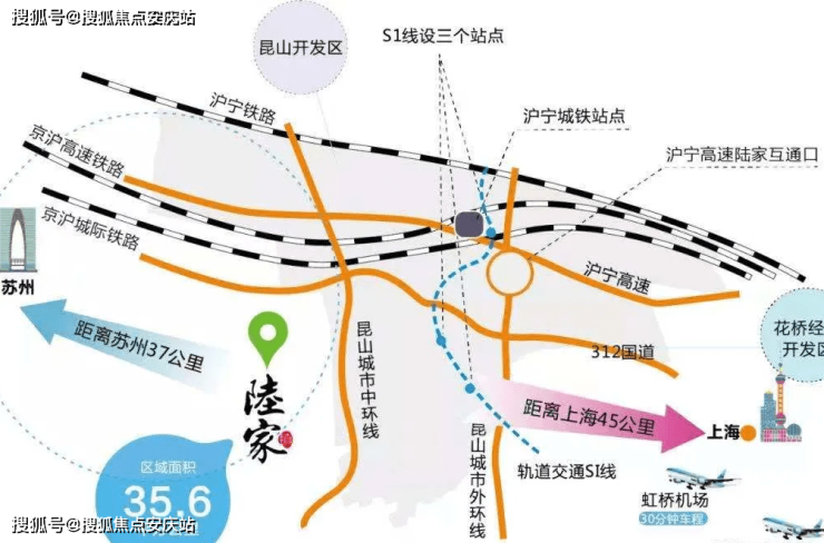 在整个长三角一体化背景下,昆山处于苏州与上海的中间,而花桥、陆家又在昆山和上海的中间,区位优势肉眼可见。