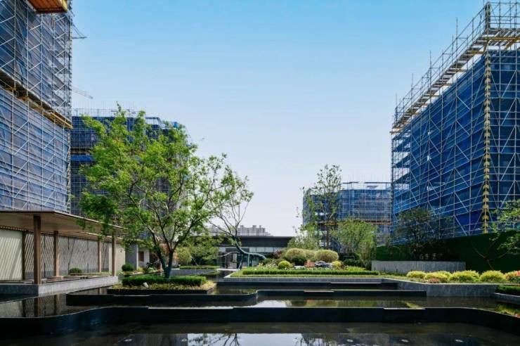 水景两侧的绿轴景观,以开放之姿和建筑有序相连,构筑出宽阔的露天中庭。