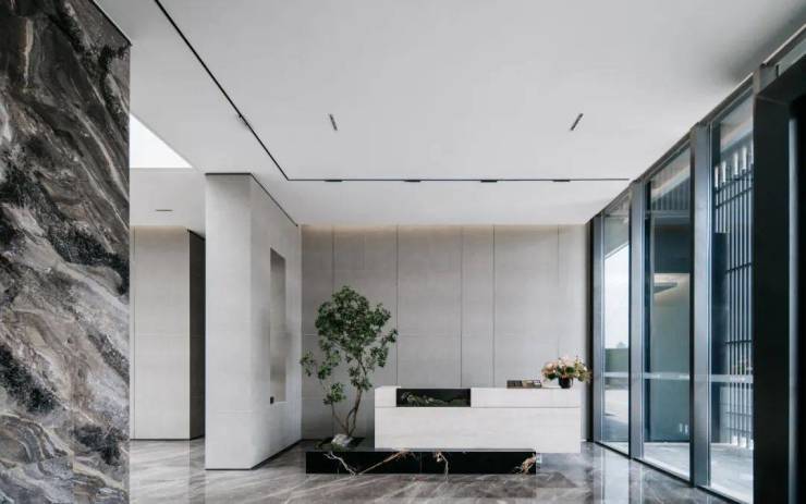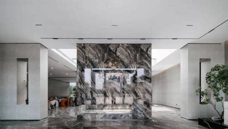 更为惊艳的是,颜值与尺度兼具的巨幅门头,运用厚重石材与金属格栅对称组合的同时,其灰白色系也和地砖形成完美呼应,既凸显现代美学的张力,又通过强烈的秩序感营造出堪比艺术展的仪式空间,豪宅巨筑气场油然而生。