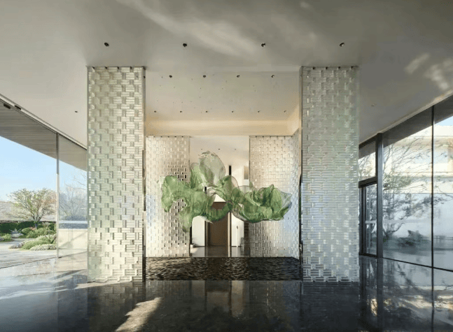 泛会所:规划约 155m² 现代美学海派风奢装泛会所,内部采用四面落地窗设计,配备中央空调,地面采用拼花地砖,墙面运用浅色石材、木饰面和皮革等材质搭配,设置了会客区、水吧区、聚会区等功能区域。