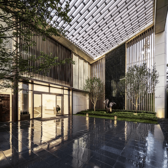 景观设计:浅米色外立面,线条简洁,营造出精致奢雅的美学气质。住区绿植如荫,会客廊架、阳光草坪、下沉式围合休闲庭院穿插其间,还有别具艺术气质的景观小品点缀,依势造景,层层递进,营造出立体丰富的归家风景3。