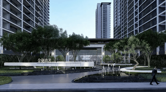 建筑细节:高层采用莫兰迪灰铝板+大玻面设计,排屋以珍珠蓝石材干挂,兼顾美观与实用性。