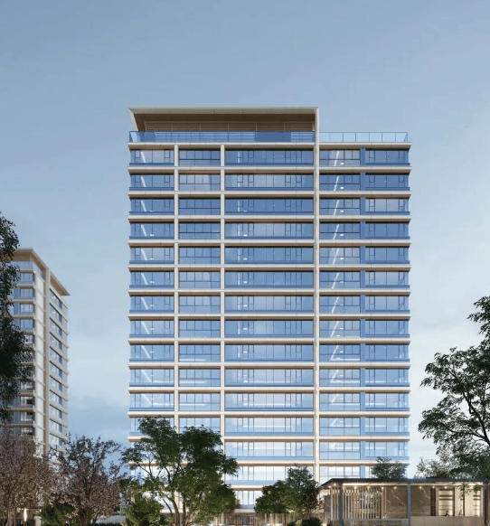 建筑风格:采用现代简约风,外立面采用大面积玻璃加铝板,打造出非对称 L 型立面,主体色彩选用带光泽感的金属色和米黄色系列,细腻高雅。