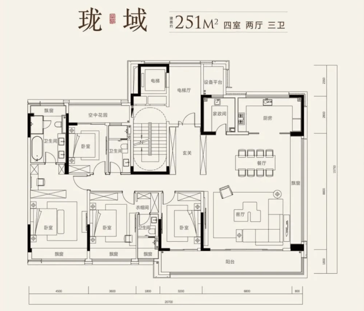 建面约251㎡,四室两厅三卫:层高约3.3m,厨房旁配有家政间。餐客厅有270°的环幕视野,搭配约10.8m超长阳台,视野效果极佳。和195㎡户型一样,北面次卧还连接一个空中花园。