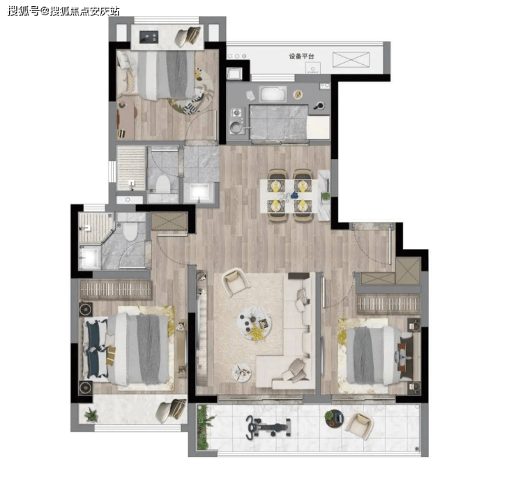 建面约118㎡三房两厅两卫的户型, 将原本应该是140㎡豪宅元素全部放入其中,简直是一次空间格局降维打击。