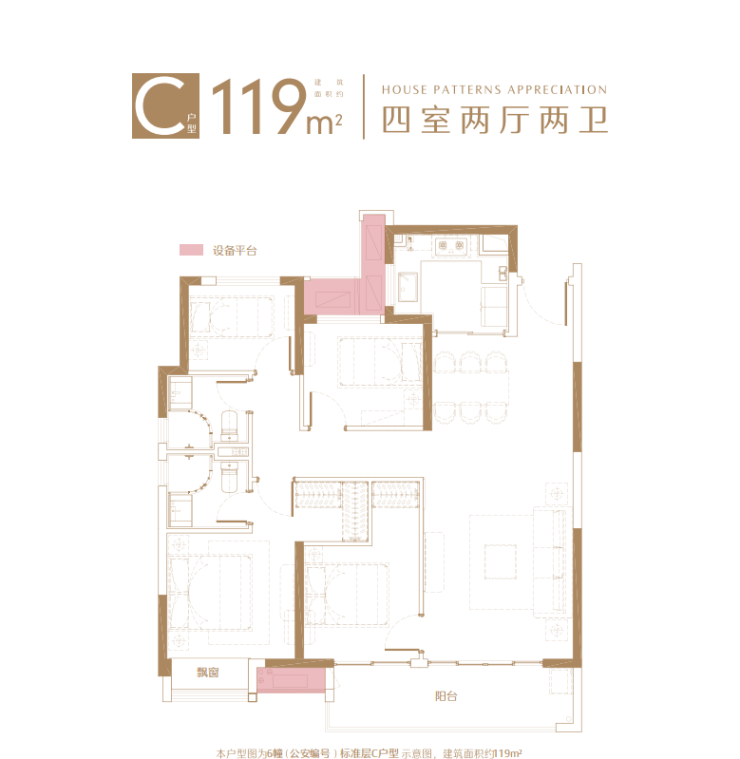 本项目备案名:璟禧云庭(北区住宅),璟禧生活广场(南区整个地块含住宅),璟禧商务中心(北区超高层+办公+沿街商业),开发商:苏州骏恒房地产开发有限公司;本户型图为6幢楼(公安编号)标准层C户型图,建筑面积约119平米,建筑面积为估算,相同户型单位因楼栋、楼层、单元等差别,局部结构、细部尺寸,面积等可能不同;户型图中的装修装饰、家居布置、空间布局等仅为示意,不作为实际交付标准或合同样品;本资料仅为要约邀请,不构成出卖人的要约或承诺,买卖双方的权利义务以双方签订的《商品房买卖合同》及其补充协议为准;相关宣传内容不排除因政府相关规划、规定及出卖人分期规划、未能控制等原因而发生变化,如有修改、调整恕不另行通知,敬请留意最新宣传资料。