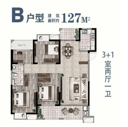 127㎡户型:4 室 2 厅 2 卫,户型方正、采光通风良好,能够满足改善型家庭的居住需求。