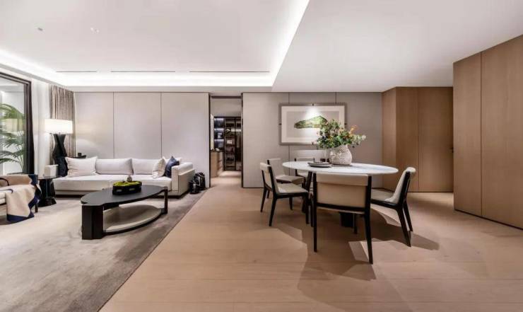 比如客厅的背景墙,在同行都纷纷上岩板时,天安1号却改变了一期的岩板,采用大面积木饰面,让整个空间更自然协调,视觉与触觉感觉都更加舒适。