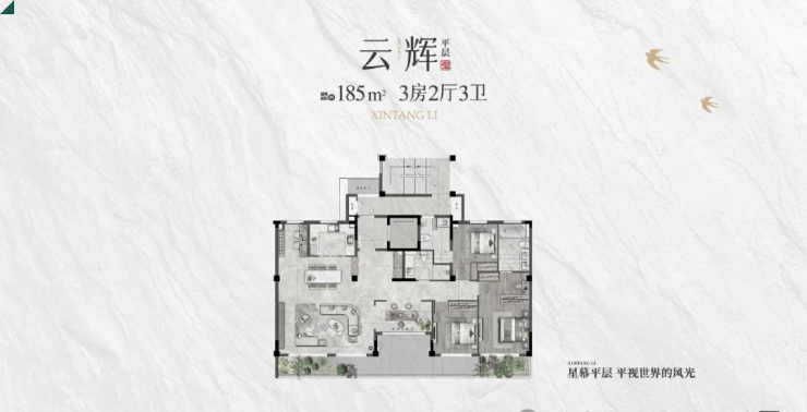·建筑面积约为184.54㎡3房2厅3卫的户型,此户型都采用了一梯一户的专属设计,私密性及舒适性极高。