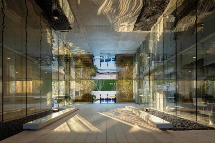 归家的入口廊道中,镜面不锈钢的天花板,与环境无缝相融,犹如时光的长河,从过去穿越到现实,穿越时间,终拥故乡的港湾。