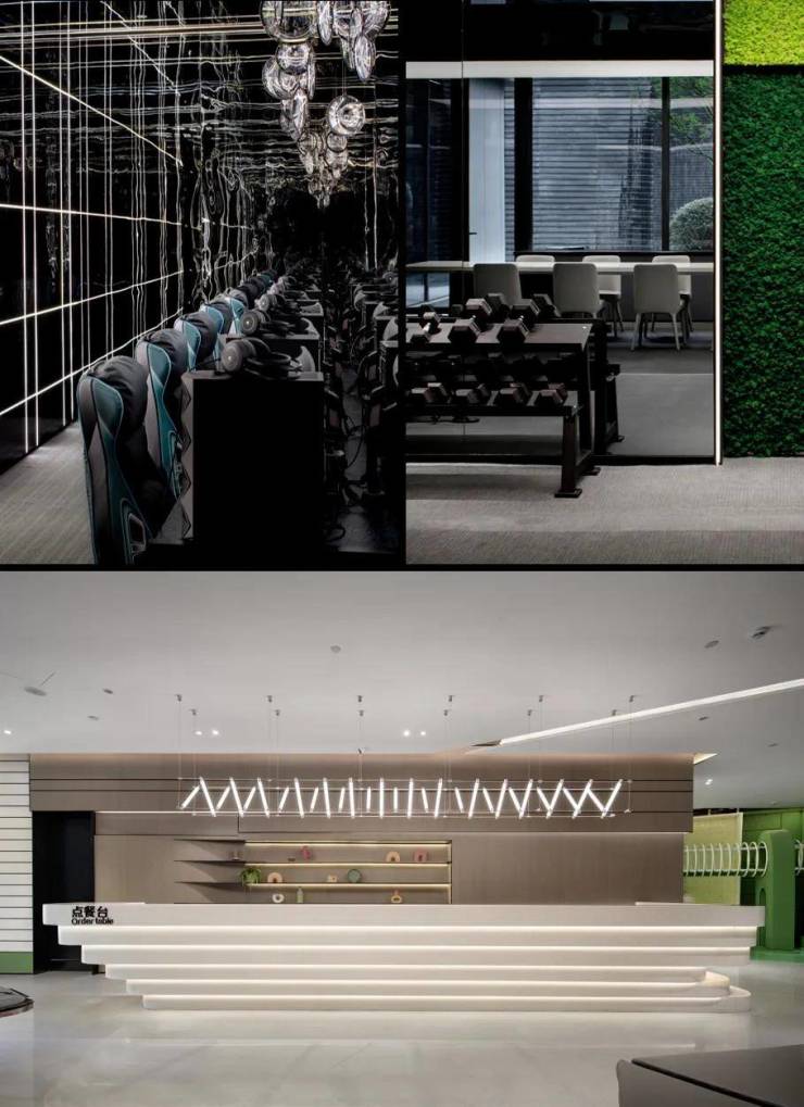 运用材料的搭配和细部节点推敲,营造未来科技感。通过软件模拟与工厂预制相结合,用渐变的穿孔铝板形成逐渐变化的视觉肌理,铝板的排列组合与充满动感的建筑外形相结合,使示范区仿佛在不断的起伏变化。