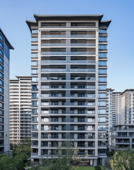 小区采用“高层+低密”分区规划,建筑风格兼顾现代简约与新中式韵味,打造差异化美学体验。高层区以“清新雅致”为基调,采用南偏东15°黄金朝向,最大化提升采光与观景效果,外立面选用铝板搭配大面积玻璃幕墙,部分户型配备最大约16.8米的L型弧面阳台,实现270°环幕视野,勾勒出轻盈通透的现代天际线。