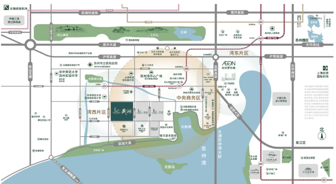 交通配套:苏州湾隧道、东太湖隧道在建,未来将贯通整个苏州湾太湖新城;苏州长江路南延工程七子山隧道暗挖段预计 2026 年建成通车;友新高架无缝链接西环、东南环、中环南线,快速通达园区金鸡湖、姑苏区等核心商圈;沪常高速、常台高速 2 大高速,直达无锡硕放、上海虹桥机场,畅达长三角多维交通路网。