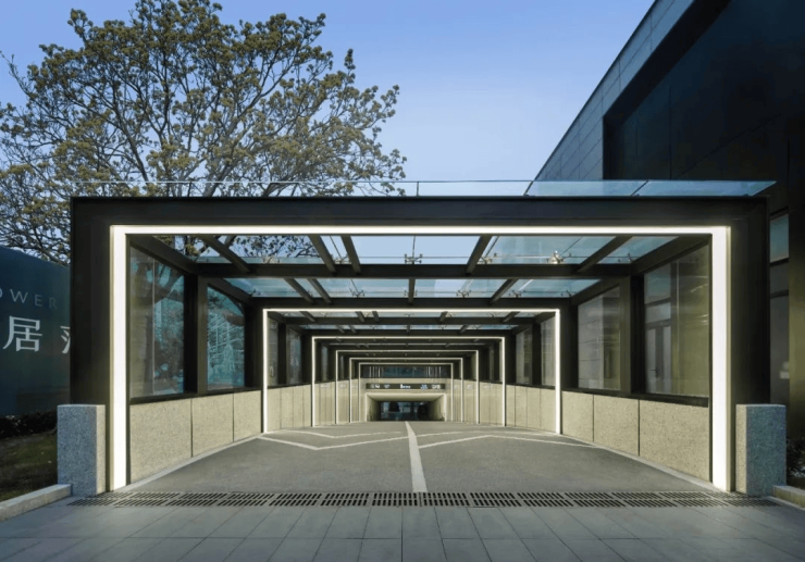 业主开车归家会经过媲美园林的“三进式入库动线”:一进门楣,二进星空吊顶玄关空间,三进精奢车位。
