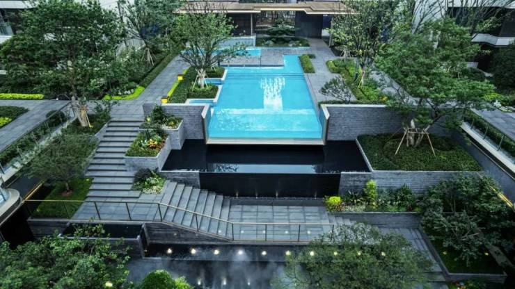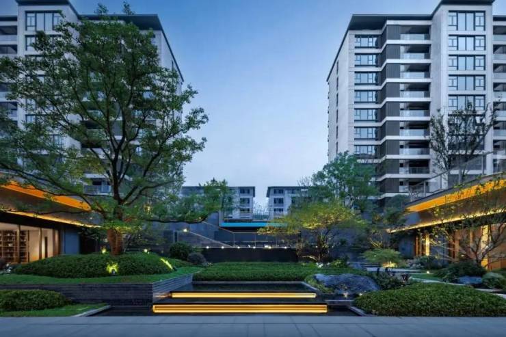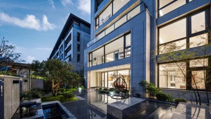 产品形态:洋房多为 4+1/6 层,一梯两户 / 一梯一户;叠墅为上下两叠设计,独立入户 + 电梯,部分带庭院 / 星空露台;洋房精装交付(中央空调 + 地暖 + 新风),叠墅毛坯交付;外立面干挂石材 + 铝板 + 大面积玻璃,新中式风格;社区规划 “三进三轴七重” 归家礼序,中式园林水景 + 亭廊 + 植被层次丰富