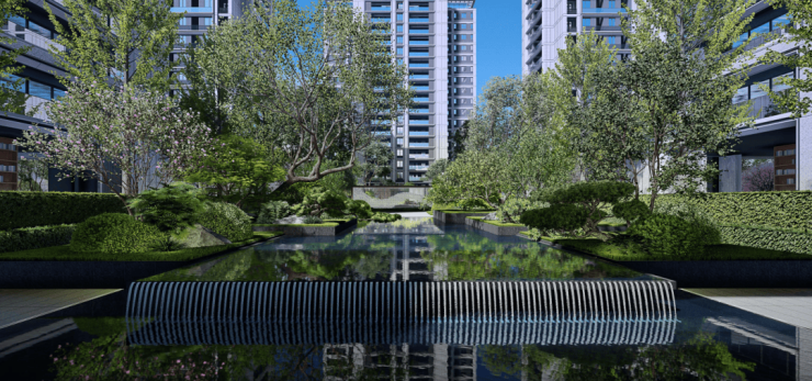感受水音的治愈和被自然包裹的愉悦,来到了第三重仪式中庭空间,如同江风雅颂府的“中央会客厅”,与东、西双园沿着中轴线左右对望,更能感受城芯繁华与自然生态交汇的曼妙。