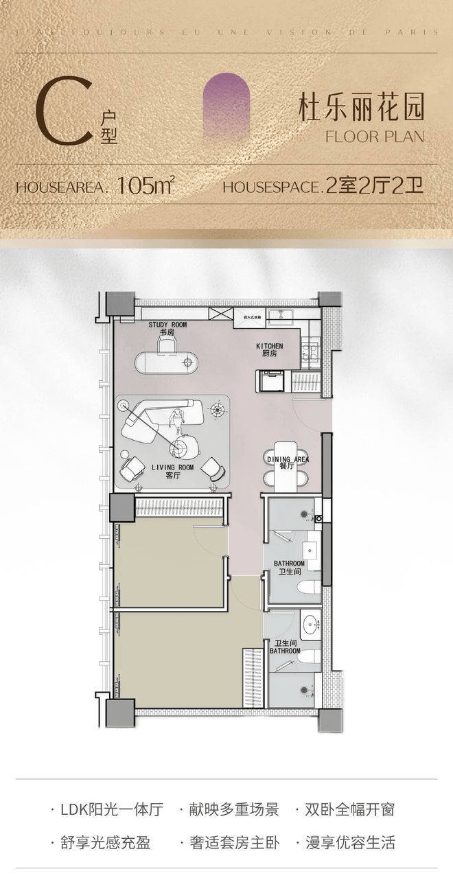105㎡:2 房 2 厅 2 卫,以杜乐丽花园为主题,布局精巧,空间利用合理,满足小家庭的居住需求。