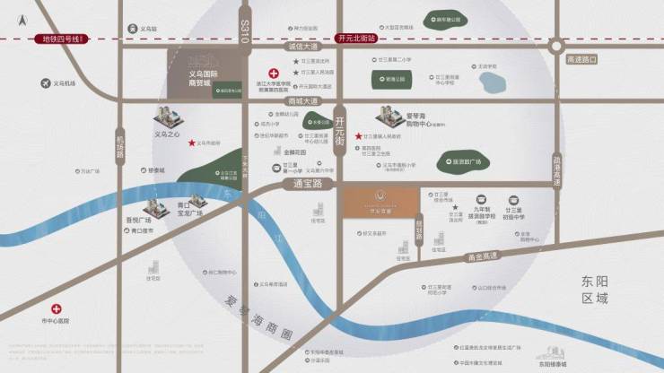 双主干道:项目毗邻通宝路与开元街两大交通主轴,贯通城市东西,快速通达义乌主城中心;道路距离约2.3公里处有义乌绕城高速廿三里高速收费站,可快速到达义乌各处和周边各大城市。规划中的轻轨4号线贯穿廿三里,多维度立体交通路网满足不同人群多样的出行方。