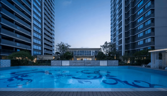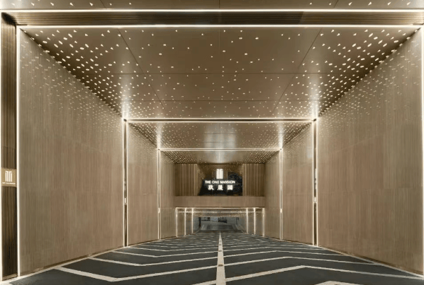 地下车库:地库主出入口设置了不规则香槟金穿孔铝板搭配嵌入的 LED 光源,打造出 “劳斯莱斯同款星空顶”,地库主车道采用与云境园、名境园同款的水磨石地坪,提升业主归家体验。