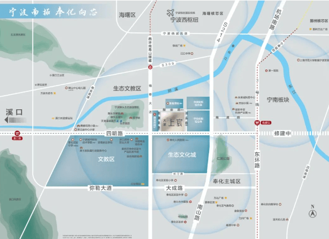 交通配套:紧邻南山路、中山东路双主干道,周边直线 1km 内有 11 个公交站,距离最近的四明路河山路口站仅有 185m,距奉化高铁站仅 3 公里,15 分钟车程可直达宁波主城区34。