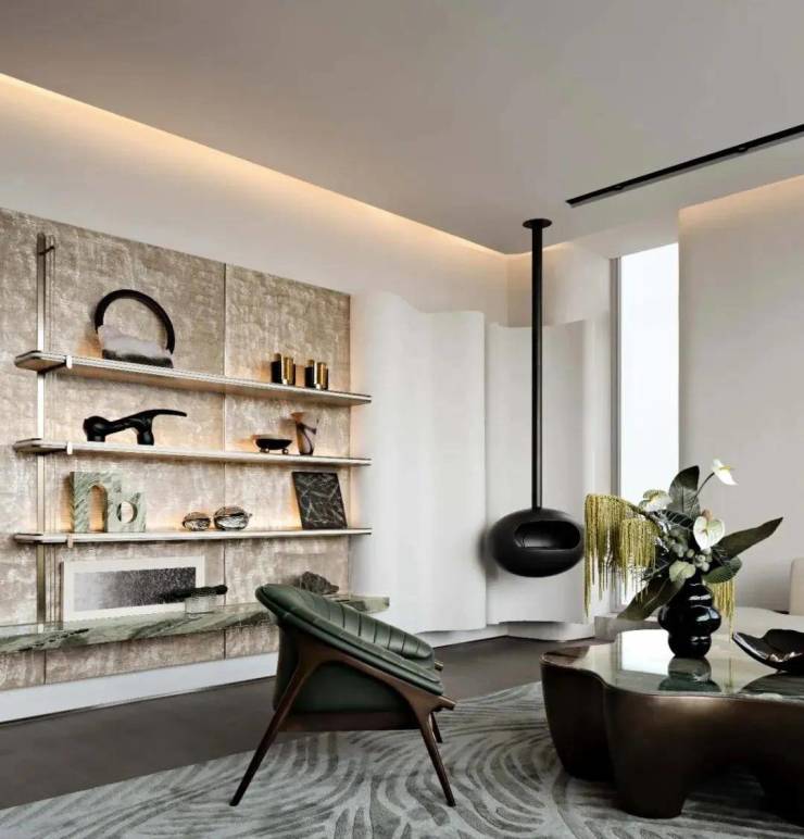绵延婉转的曲线自下而上地延展,形成一处独特的风景线,赋予空间艺术审美与哲思,墙面的金属灯带映衬出斑驳的光影,调动空间情绪,在写实和写意之间烘托出万籁生间的氛围。