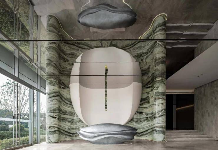 倚山临湖的无锡,“水”是这座城市的灵魂,浸润着不断传承的城市基因。“绿松石”奢石以深邃的质感和奢雅的格调,赋予空间灵动柔和的自然之韵。银色金属接待台呈现出现代主义的抽象与纯粹,搭配圆弧形白色饰面艺术装置,描绘出“太湖明珠”的灿烂图景。