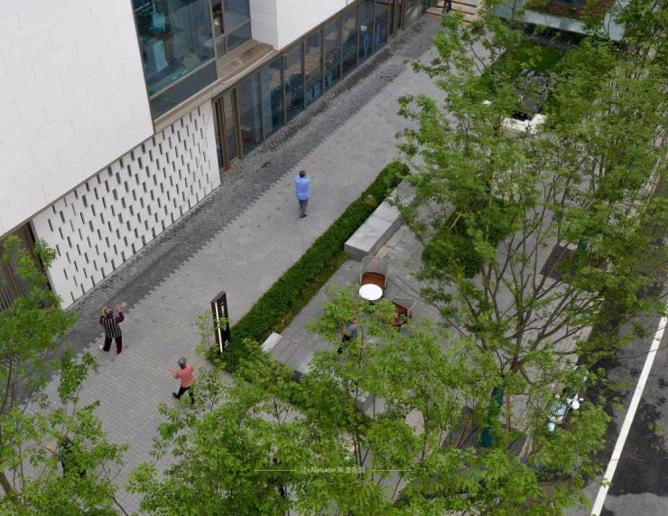▲入口宽厚的绿荫是奇妙巧合,为设计提供了新的可能。我们保留了场地中现有的每棵行道树,以此营造更加隐奢的空间感。
