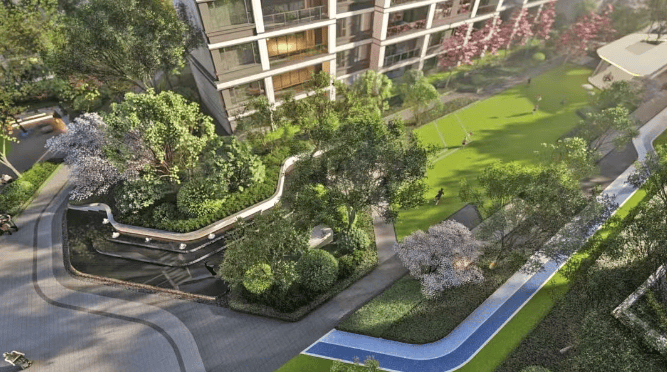 景观设施:有约 280 米的林荫景观大道,500 米的夜光环氧跑道,5 处静谧休闲花园,为居民提供了散步、慢跑、休闲的好去处。