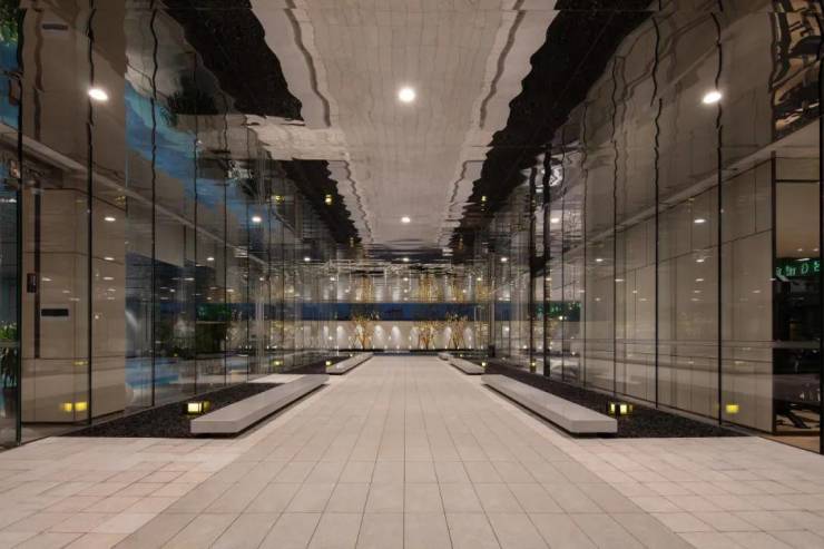 归家的入口廊道中,镜面不锈钢的天花板,与环境无缝相融,犹如时光的长河,从过去穿越到现实,穿越时间,终拥故乡的港湾。