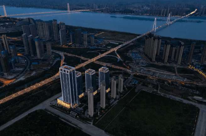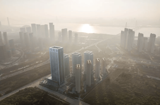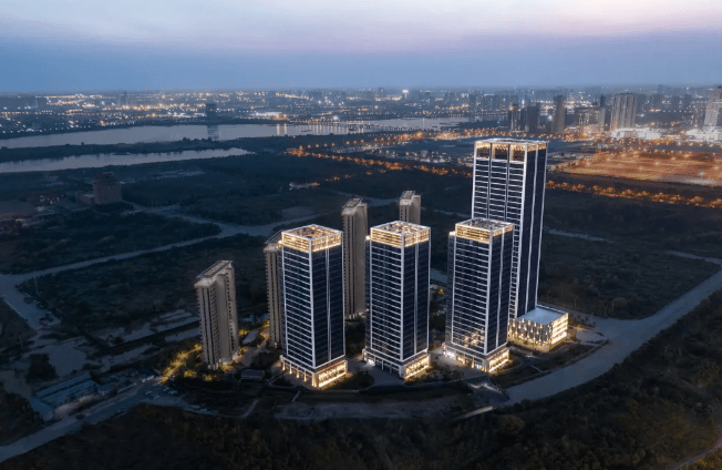 建筑布局:由 8 座单体建筑构成,4 栋为办公、4 栋为住宅,建筑天际线南低北高,围合出中心景观花园。