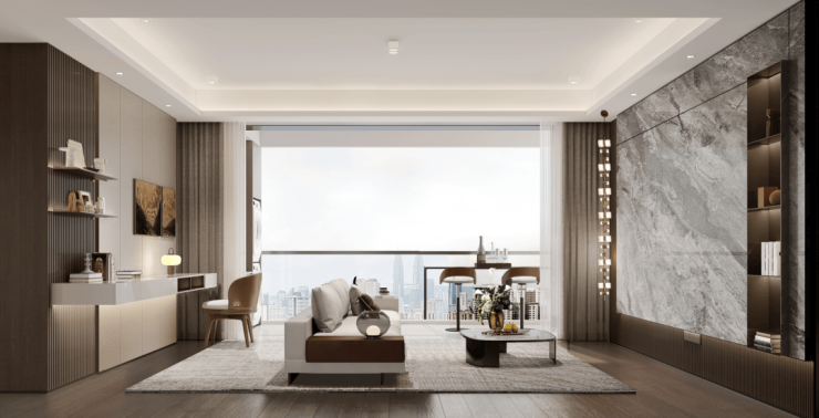 建筑设计:外立面采用了香槟金色铝板、铝合金窗框、灰色金属漆、仿石一体板等高端建材,呈现 “云庐系 Trees villa” 观景立意,以大面积玻璃幕墙直面自然,让建筑与自然景观相融合。