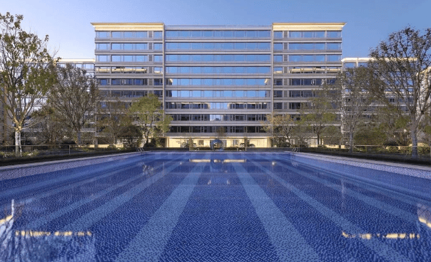 建筑设计:建筑外立面采用天然石材、一体化板材和铝型材线条,以莫兰迪湛蓝灰色调为主,呈现简约精致的视觉效果,腰线设计精巧,层次丰富,窗墙比高,拥有 IMAX 级宽境视野。