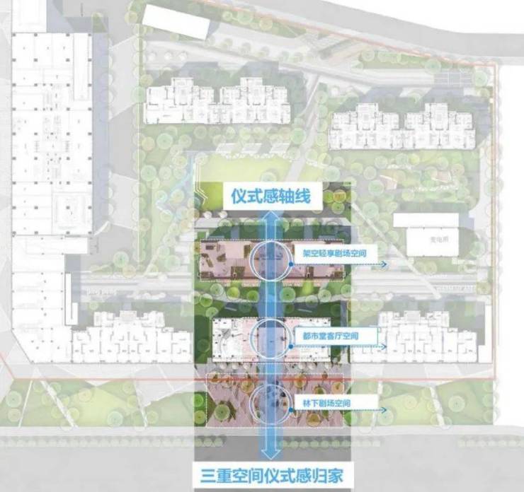 规划结合场地沿街面采用“南向入园,由南至北,递进院落”的格局,打造“林下”+“厅堂”+“庭院”情景化的归家三进院落,都市会客厅位于最南端,未来的使用功能是社区归家大堂、物业、配套用房及商业,它和北侧的泛大堂架空层共同组成社区的邻里交往空间,形成:城市步行系统→林下空间→归家门厅→堂客厅→后场庭院→架空层的归家仪式动线。