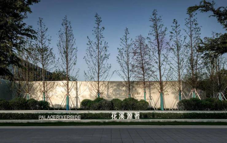 入口横向延展面设计从动态的夏溪河水纹中提炼意形与光影元素,融入到建筑的一体化设计中,大有“言入夏溪曲,光影转庭柯”的朗阔雅境,大气开阔又不失婉转潋滟。在地文化与现代审美相互渗透的秘境溪居跃然呈现于门庭,铺陈开崇高而永恒的流水情怀,隔绝喧嚣,启幕自然。