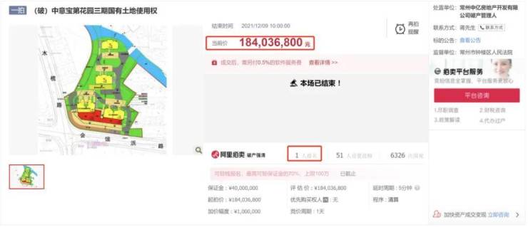 2021年12月8日起对常州中意宝第花园三期国有土地使用权进行了拍卖,最终成交价1.8亿元。