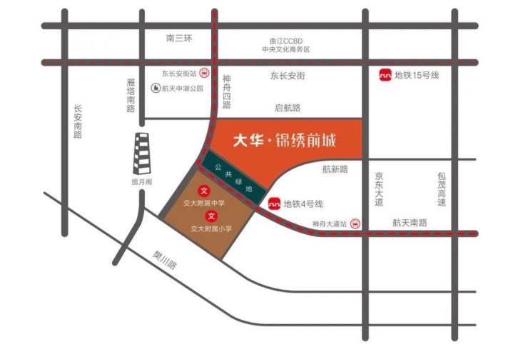 项目西侧1.3公里国家设计大师张锦秋设计揽月阁、北侧1公里航天城中湖公园、1.7公里星河运动公园。区域内云集航天科工集团、航测遥感集团、中铁建设集团、陕旅集团,广电中心也已在此规划办公和住宅区。