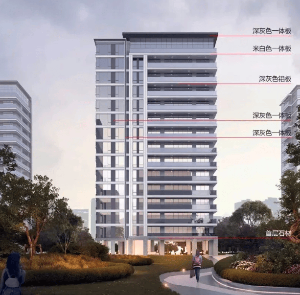 建筑设计:采用底部天然石材 + 天幕玻璃 + 铝板线条格栅 + 保温一体板的外立面设计,南立面窗墙比达到了约 46%,提升了建筑的品质和美观度。