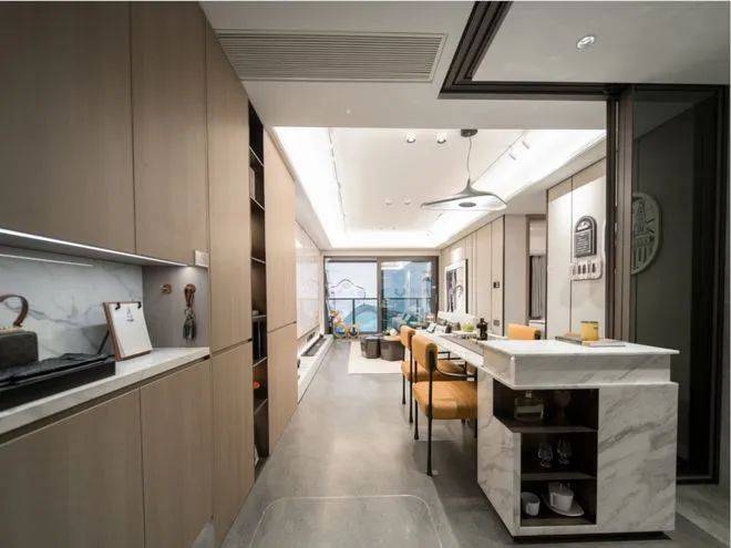 全屋墙布交付,甚至连局部免漆木饰面格栅+仿大理石岩板也是交付标准,诚意之高见微知著。