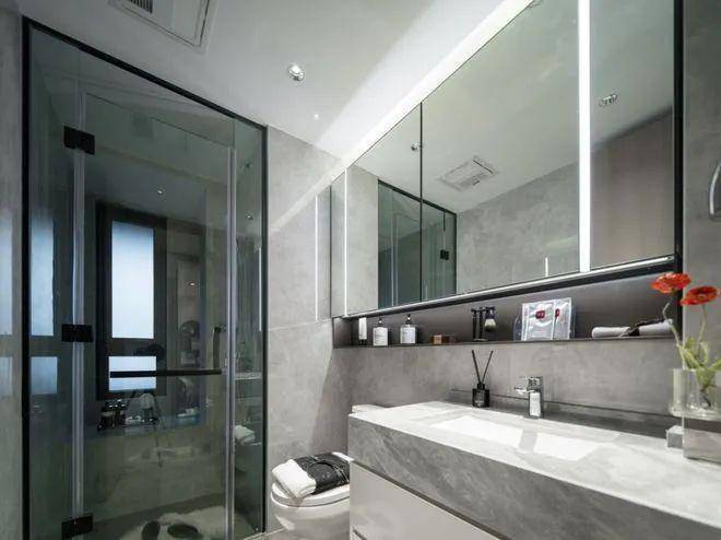 在卫生间,主卧镜柜内置美妆冰箱,方便女主人储物各种面膜,化妆品等物件。客卫镜柜内置插座,可以给电动牙刷、剃须刀充电,吹头发也不用扯长长的电线。