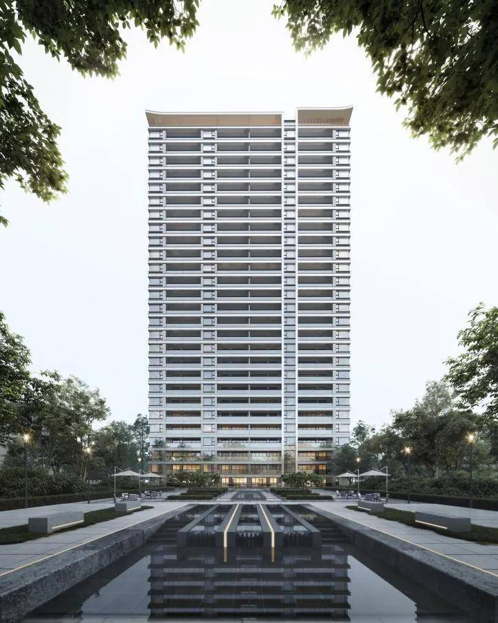 整体采用现代中式的风格,以“书香门第,儒雅文化”的设计思路,采用超大窗墙比,体量划分舒展、轻盈,辅以金属,玻璃,石材和铝板一体板等材料,强化高端公建化的立面形象,形成精致的高定人居体验。