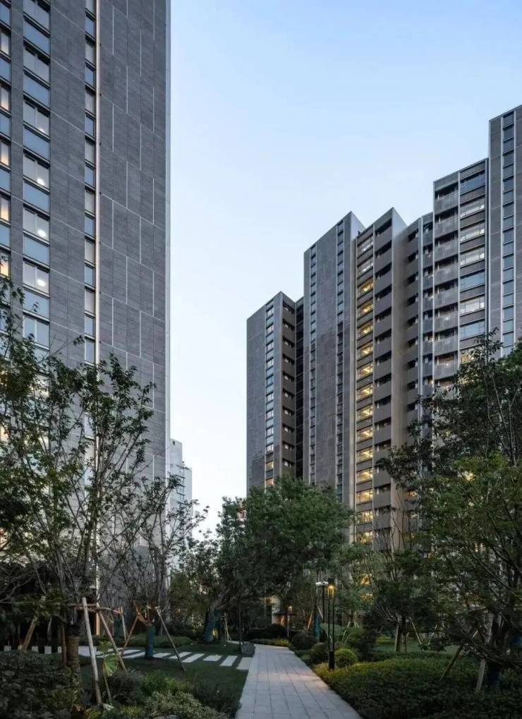 社区规划:70 年住宅,总占地约 1.72 万㎡,总建面约 9.44 万㎡;3 栋 19-23 层住宅 + 1 栋 17 层办公楼,总户数仅 240 户,容积率 2.18,绿化率 35%,车位比 1:1.7,人车分流,最大楼间距 42 米;现代简约立面(铝板 + 花岗岩 + 玻璃幕墙),“一轴三院五园” 景观,自带社区商业与 9 班幼儿园。