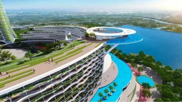项目分二期开发:一期打造特色水乡小镇和以国际会议综合体“环球中心”为主的生态健康智慧新城;二期打造温泉小镇及酒店核心区。