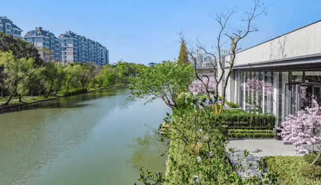 建筑设计:建筑采用现代风格,外立面以铂金灰为主色调,搭配大面积的 Low - E 全景落地玻璃,窗墙比高达 0.42(远超市面普遍的 0.3 窗墙比) ,不仅让建筑外观简洁时尚、富有质感,更实现了室内空间的极致采光与通透视野。阳光可肆意倾洒入室,窗外河景与园林景观尽收眼底,大幅提升居住舒适度与品质感。