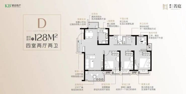 ④ 建面约128㎡,四室两厅两卫。更多的房间,满足更多的家庭成员生活需求。户型四面朝南采光,让整个房子全明通透;超大尺度客厅是家庭聚会的好地方,套房式主卧,尊崇性与私密性兼得。