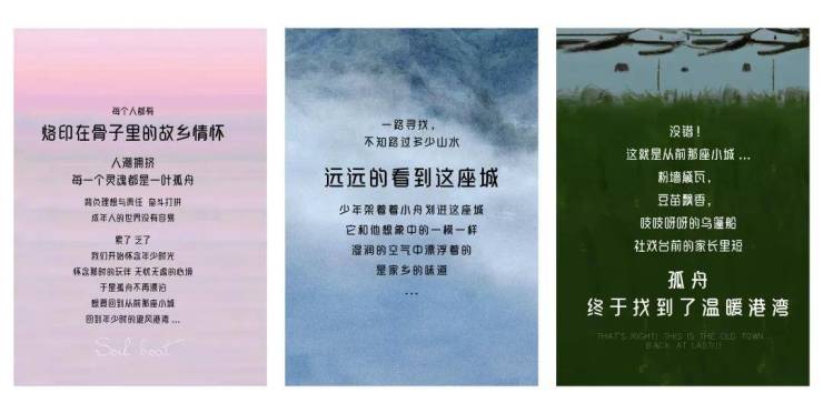 以故事中“欢笑启航”的场景元素:夜色朦胧下飞快的行舟,满河的星辉都被它搅碎了,那只小小的航船枕着清波,载着我们回溯,回溯,去寻梦,寻歌…