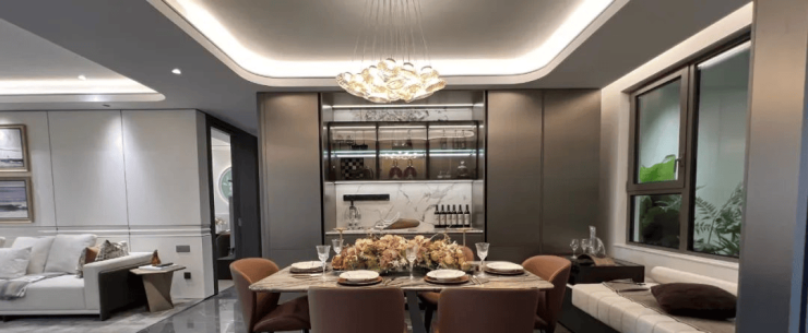 四开间朝南、餐客厅一体化设计,马可波罗地砖,定制背景墙交付,大面积落地窗,使整个视野非常通透。